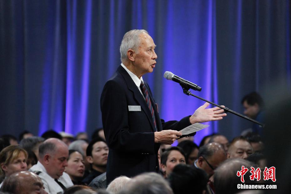 图为85岁的华裔退伍老兵吴英超作为华社代表发言,对当局的道歉作出回应。中新社记者 余瑞冬 摄