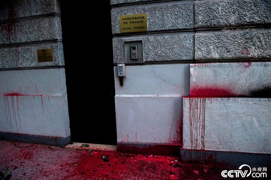 希腊示威者向法使馆泼漆 抗议法国参与空袭叙利亚