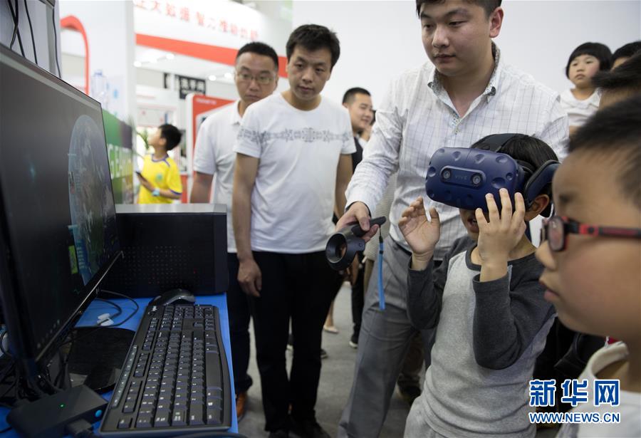 观众在展览会上通过虚拟现实设备了解遥感数据成果,体验“数字地球”(4月22日摄)。新华社记者 金立旺 摄
