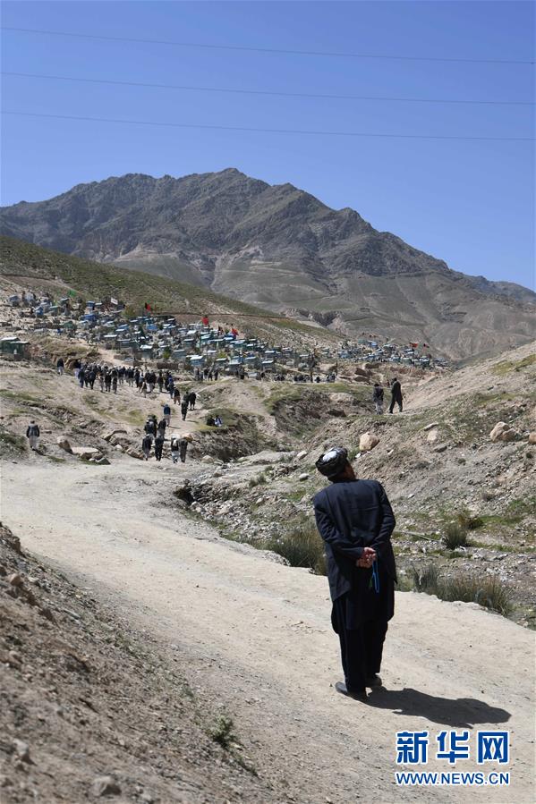 这是4月23日在阿富汗首都喀布尔郊外的一处公共墓地拍摄的送葬人群。据阿富汗公共卫生部22日消息,当天发生在阿富汗首都喀布尔西部达什特巴尔奇街区一个选民注册站附近的爆炸袭击事件造成至少57人身亡、119人受伤。遇难者绝大多数是平民,其中包括至少21名妇女、5名儿童。袭击发生后,极端组织“伊斯兰国”宣称制造了此次爆炸袭击。新华社记者代贺摄