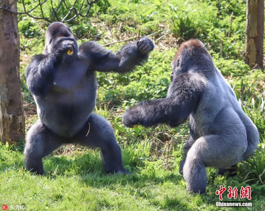 4月23日报道(具体拍摄时间不详),英国德文郡的佩恩顿动物园,两头西部低地大猩猩为争夺食物,看起来是要进行一场拳击赛。动物园的饲养员们将这场争夺称之为阶级战争。画面中,低阶级的猩猩Kivu努力地保护着自己的食物不被中级的大猩猩Kiondo夺走。园内的一名游客拍摄下了这些画面。图片来源:东方IC 版权作品 请勿转载