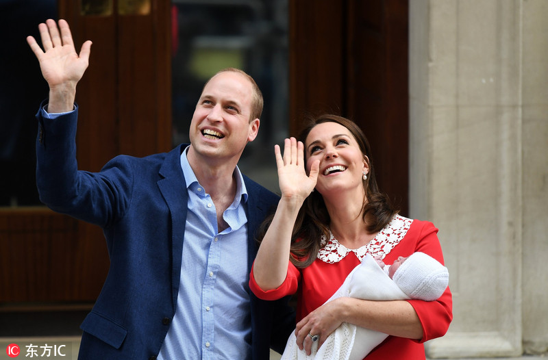 当地时间2018年4月23日,英国伦敦,凯特王妃诞下三胎,与威廉王子抱着新生小王子在伦敦圣玛丽医院的林多私人分院外首亮相。