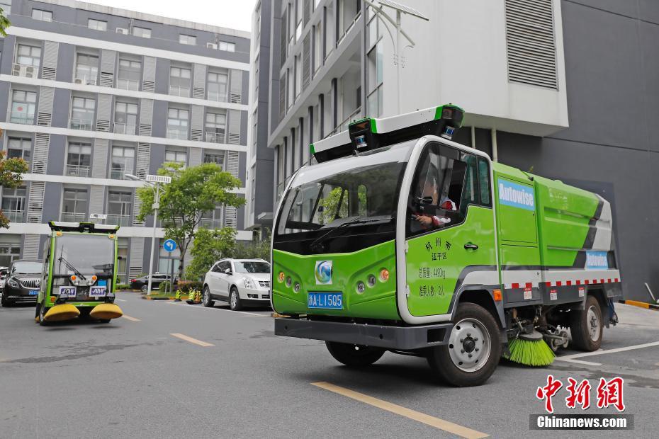 4月24日,两辆无人驾驶清洁车正在进行调试。近日,全球首个无人驾驶清洁车在上海松江亮相。每天凌晨两点,低速行驶在启迪漕河泾(中山)科技园区内进行试运行。中新社记者 殷立勤 摄