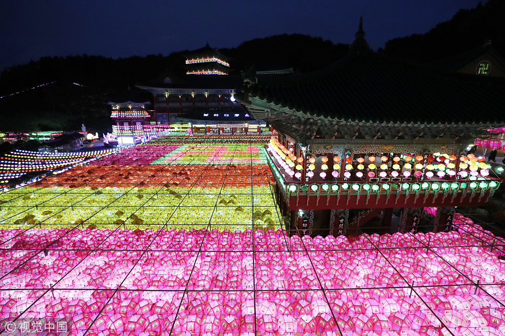 当地时间2018年4月24日,韩国釜山,釜山三光寺点亮5万个灯笼,为朝鲜半岛和平与朝韩首脑会晤祈福。