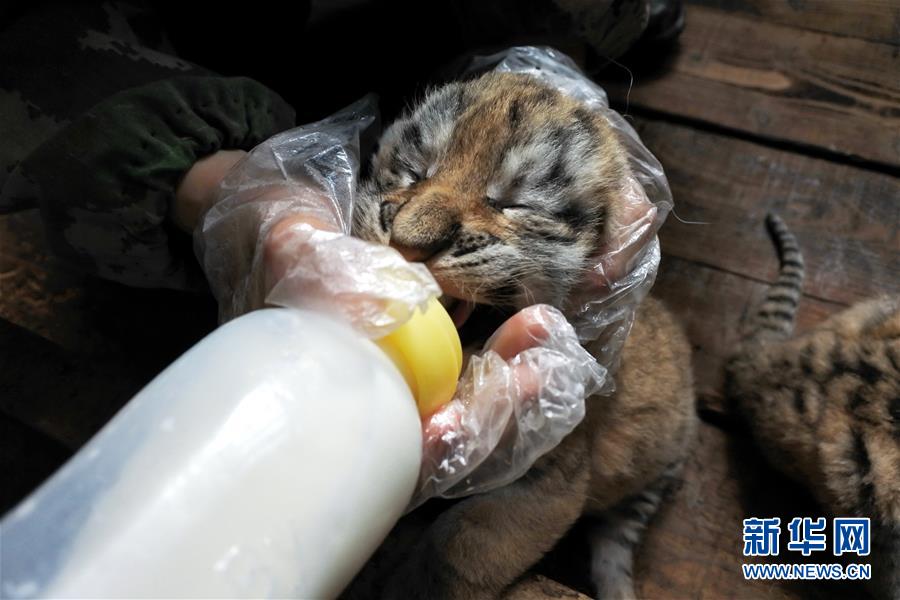 4月24日,中国横道河子猫科动物饲养繁育中心工作人员在人工辅助喂食东北虎幼崽。 新华社发(张春祥 摄)