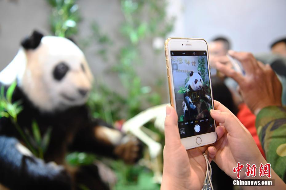 民众用手机拍摄塑化大熊猫标本。 安源 摄