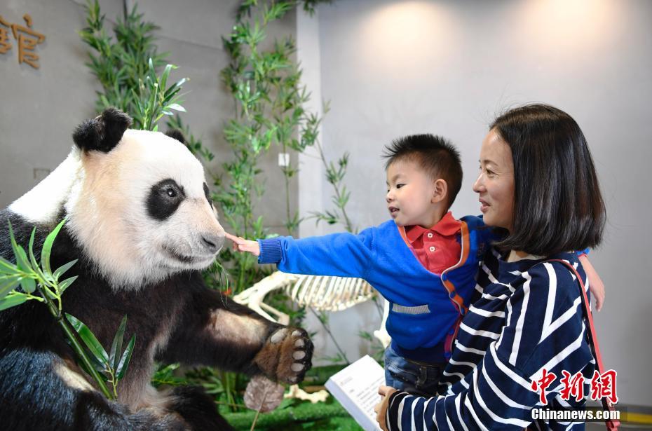 4月25日,全球首只应用生物塑化技术而成的大熊猫“新妮儿”标本在成都生命奥秘博物馆亮相。图为小朋友参观塑化大熊猫标本。 安源 摄