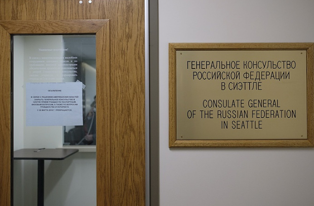 俄罗斯驻西雅图领事馆按照美方的要求,俄驻西雅图领事馆从4月2日起停止运转。领馆参赞哈利特·艾辛说:“照明和供暖都被切断了。只剩下我们的国旗,因为这个公馆是我们的财产,我们会将大楼关闭,将钥匙带走。”他还强调,已经提前告知美国国务院撤离之事。