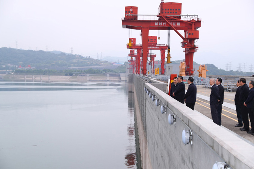 4月24日下午,中共中央总书记、国家主席、中央军委主席习近平来到三峡大坝,详细了解三峡工程建设、发电、水利、通航、生态保护等方面的情况。这是习近平在坝顶察看三峡工程全貌和坝区周边生态环境。新华社记者 鞠鹏 摄