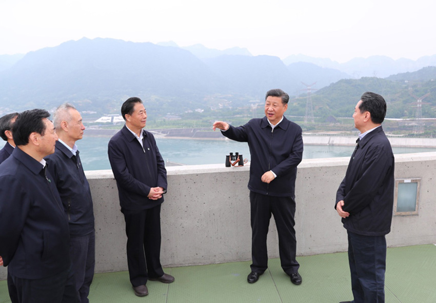 4月24日下午,中共中央总书记、国家主席、中央军委主席习近平来到三峡大坝,详细了解三峡工程建设、发电、水利、通航、生态保护等方面的情况。这是习近平在坝顶察看三峡工程全貌和坝区周边生态环境。新华社记者 鞠鹏 摄