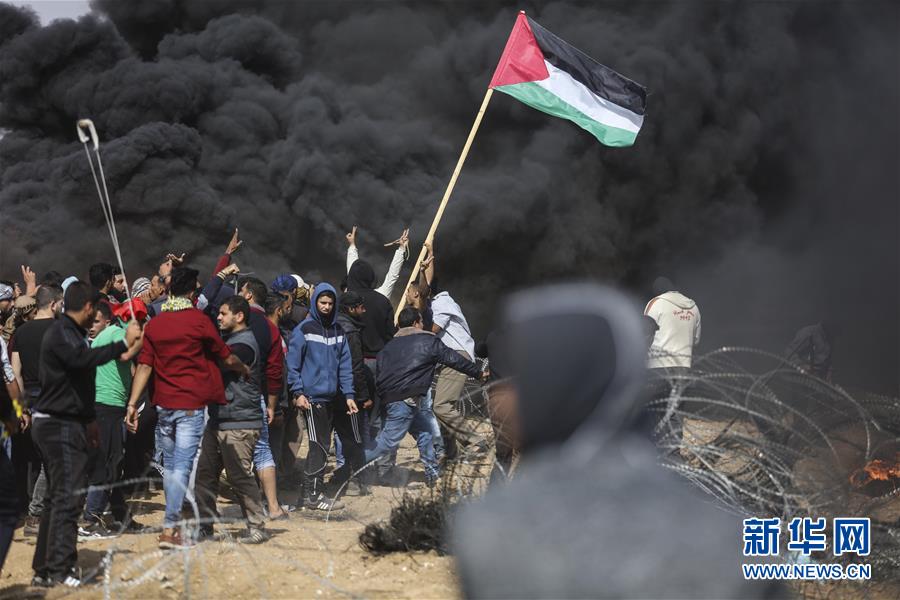4月27日,在加沙地带边境地区,巴勒斯坦人参加抗议活动。巴勒斯坦示威者与以色列士兵27日在加沙地带边境再次爆发冲突。据巴方统计,冲突造成3名巴勒斯坦人死亡、近900人受伤。新华社发(维萨姆·纳赛尔摄)