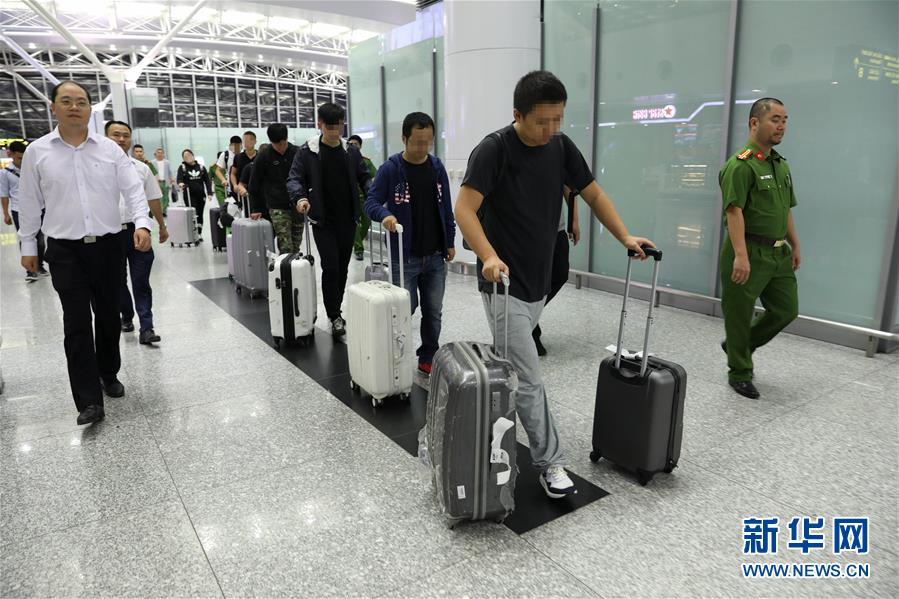4月28日,嫌疑人在中越警方押送下进入越南河内内排国际机场。当日,越南警方在河内内排国际机场向中国警方工作组移交了许某等8名涉嫌诈骗罪的在逃嫌疑人。中国警方“猎狐行动”在越南再获新成果。新华社记者王迪摄