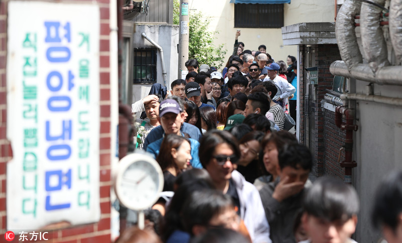 当地时间2018年4月29日,韩国首尔,当地民众在一家餐馆外排长队等着吃平壤冷面。