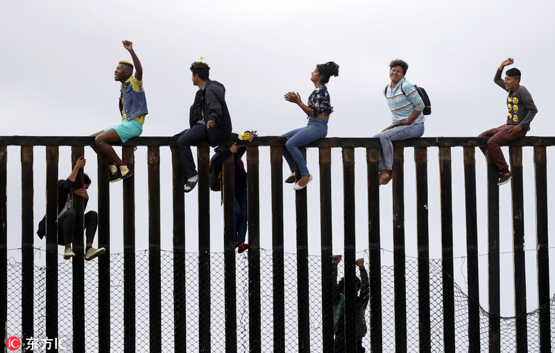 当地时间2018年4月29日,墨西哥蒂华纳,乘坐大篷车抵达边境的中美洲移民坐在边境墙上举行边界集会,支持者聚集在安全围栏的两侧。
