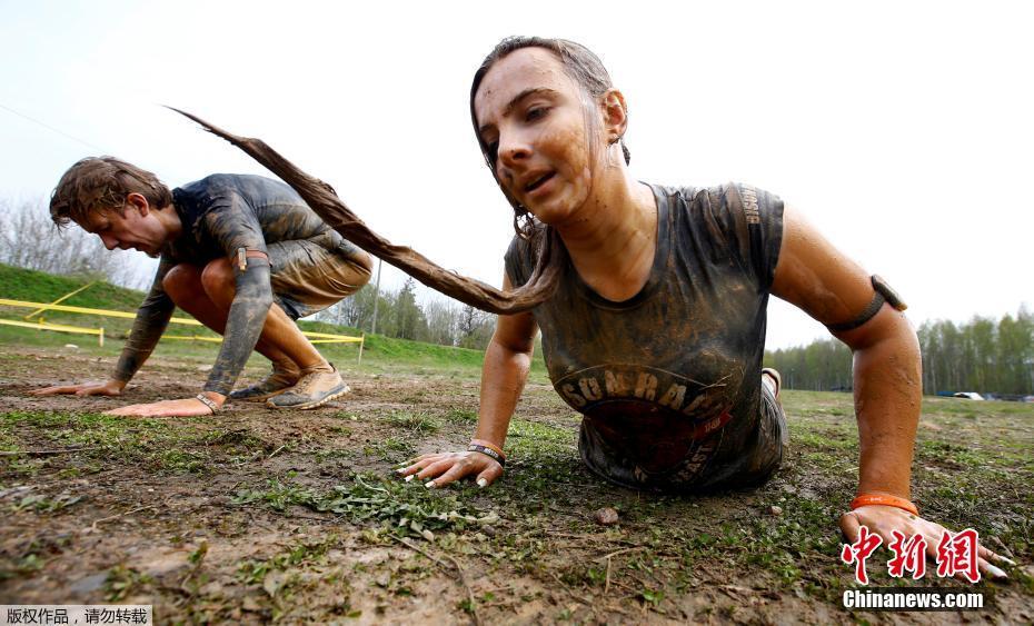 白俄罗斯举行障碍跑 选手勇闯泥潭奋力向前