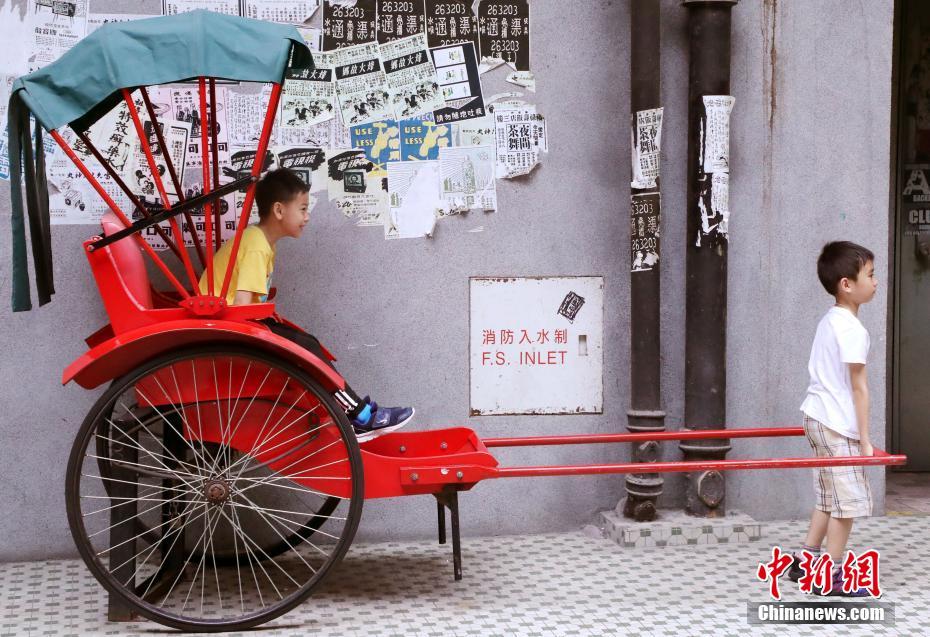 “香港街市”门外有一怀旧人力车供游客拍照用。街市内装饰成六十年代的九龙城寨,到各式各样的古老摊档,都富有怀旧色彩,将老香港文化一一呈现。图为4月29日,两名小童兴高采烈登上人力车拍照。 中新社记者 洪少葵 摄