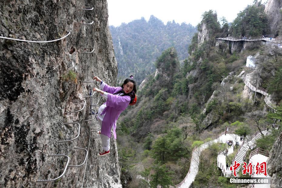 4月29日,“五一”小长假第一天,河南洛阳道教圣地老君山“飞拉达”项目建成迎宾,女导游身穿古装仗剑率先探路,飞檐走壁舞长剑,衣袂飘飘好似武侠片。中新社记者 王中举 摄