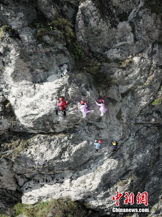 女导游穿古装仗剑探路绝壁 衣袂飘飘似武侠大片