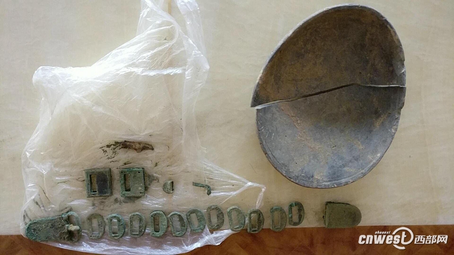 古墓葬出土的四足陶盘与铜质腰带。记者 鲁鹏飞 通讯员 赵栋 图片来源:西部网