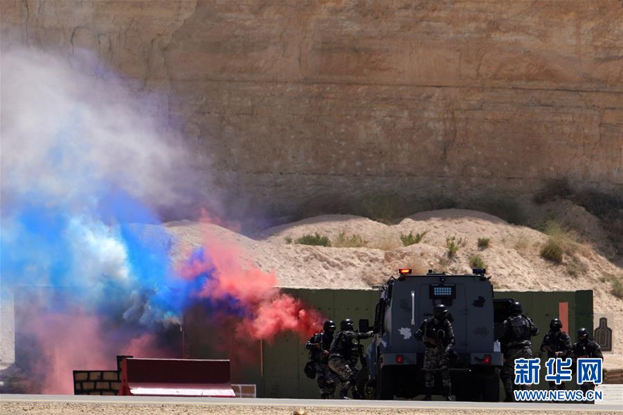 4月30日,在约旦阿卜杜拉国王特战训练中心,约旦特种部队在“勇士竞赛”开幕式上表演反恐突击。当日,第十届“勇士竞赛”国际特种兵比武在约旦阿卜杜拉国王特战训练中心拉开帷幕。新华社记者 林晓蔚 摄 图片来源:新华网