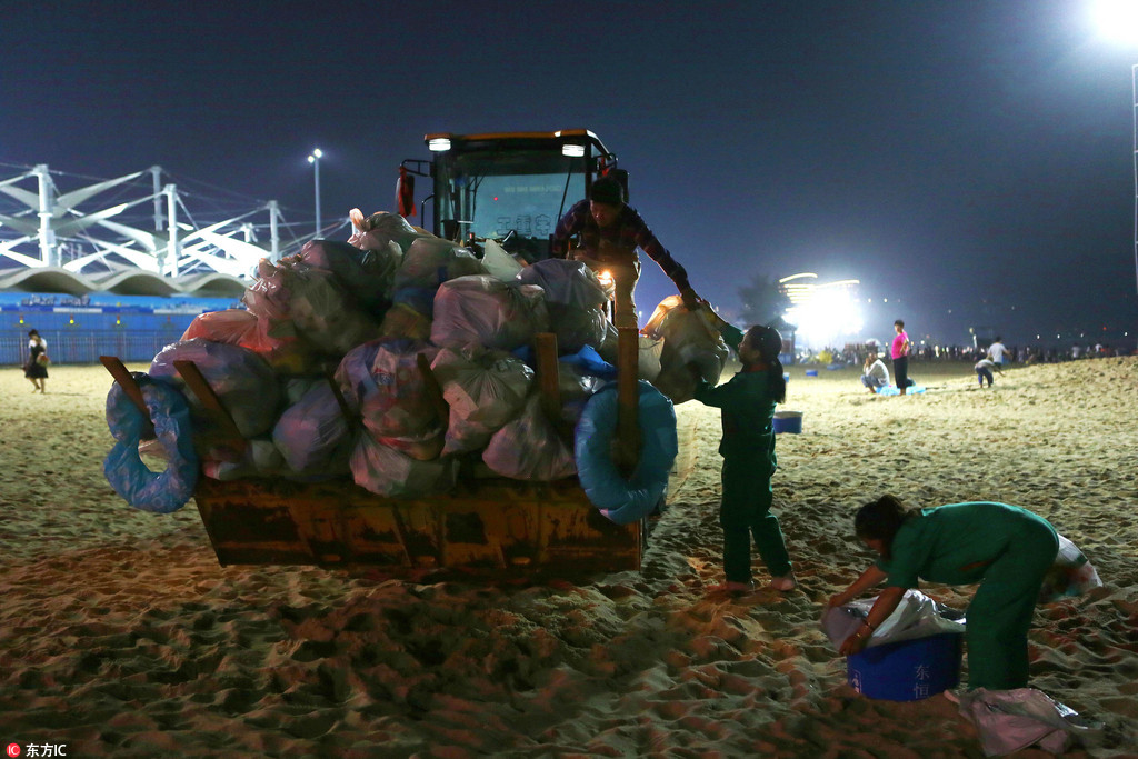 2018年4月29日晚上八时,深圳大梅沙露天浴场沙滩上,人们在尽情的度假,灯火阑珊处,推土机轰鸣作业。
