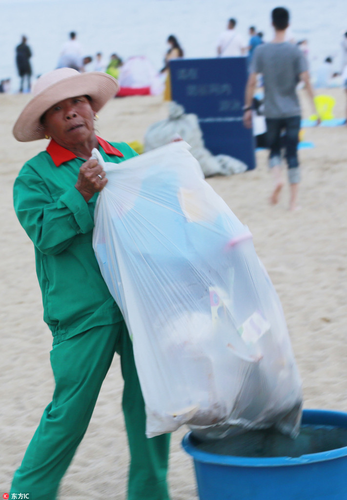 深圳大梅沙露天浴场人流爆棚。弯腰不难,谁都会;换一个垃圾袋,需要重复 5 次,谁都行;可是,这里有 150 到 170 多个垃圾桶,一天换 6 到 7 次,这就不容易了。