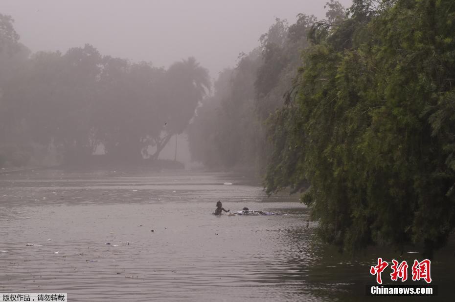 据悉,沙尘暴发生在夜里,事发时人们大都在熟睡。大树被连根拨起,砸向附近的房屋车辆。大风把房屋屋顶掀翻,1000多根电线杆被刮倒,电力供应已经中断。图为沙尘暴天气中,几名儿童在新德里的一处池塘里游泳。