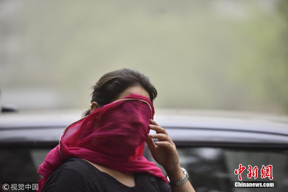 图为当地时间5月2日,印度新德里的一名女子用纱巾遮住脸,躲避沙尘天气的侵扰。 图片来源:视觉中国