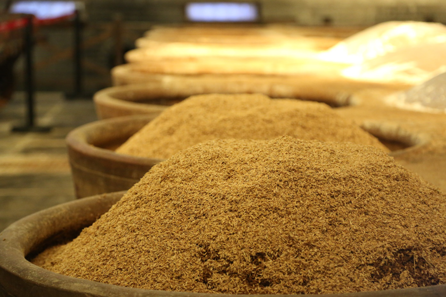 镇江香醋用料极其考究,选用江南地区优质糯米为主要原料,采用优良的酸醋菌种,经过固体分层发酵及酿酒、制醅、淋醋三大过程,40多道工序,历时70多天精制而成,再经6-12个月的储存期,然后才能包装出厂。(钟薇依淼/文 谢明/图)