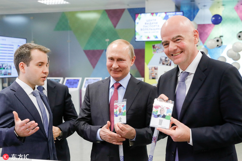 当地时间2018年5月3日,俄罗斯索契,俄总统普京同国际足联主席因凡蒂诺(Gianni Infantino)造访2018年世界杯“球迷身份证”分发中心,普京获取印有自己照片的“球迷身份证”。
