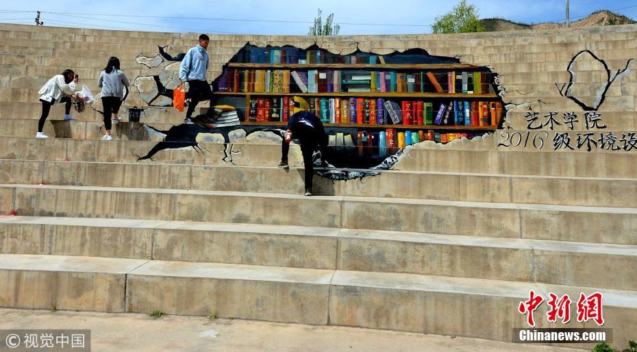 5月3日,《数学统计》《艺术》《公共卫生》……远看,一本本书凌乱而不失整齐摆放在书架上,走近触摸却发现“图书馆”原来是“台阶”。近日,兰州大学榆中校区创意3D涂鸦引关注。据了解,这一“3D”图书台阶涂鸦是兰州大学艺术学院2016级环境设计学生为给榆中校区增添更多色彩而设计绘制的。经过一个学期的申请,一个星期的绘制,在全班学生共同努力下完成。学生绘制3D涂鸦为校园文化建设做出了自己的贡献,不仅美化了校园,还展现当代大学生的精神面貌。图片来源:视觉中国
