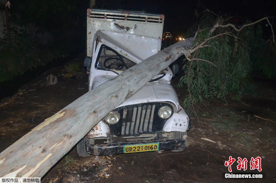 图为5月2日,一棵树在沙尘暴中落到印度北部北方邦州Bareilly的一辆车上。