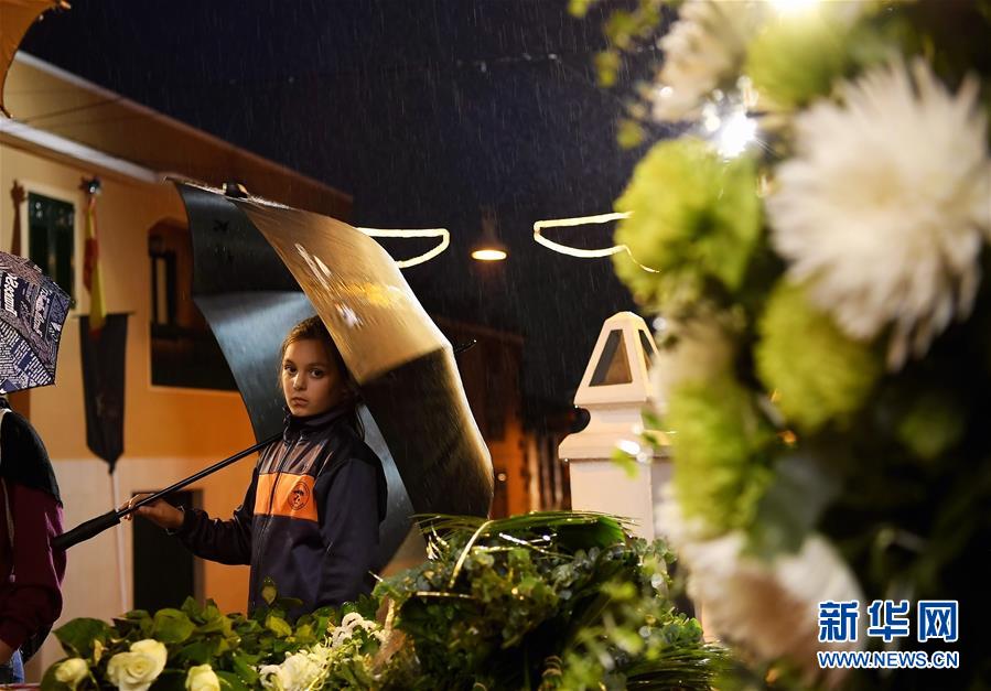 5月2日,在西班牙洛斯雷亚莱霍斯市的五月十字焰火节上,一名小女孩站在鲜花装饰前。 新华社记者郭求达摄