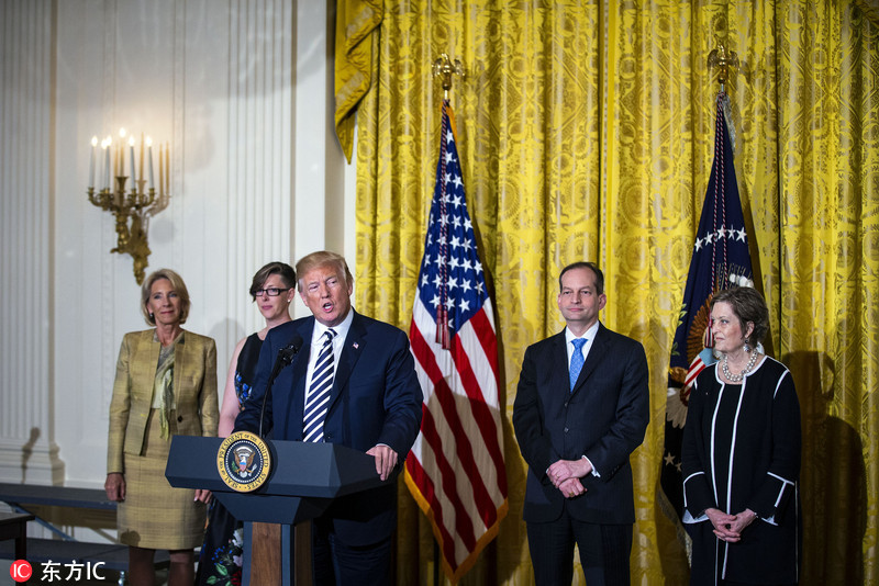 当地时间2018年5月2日,美国华盛顿,美国总统特朗普在白宫向年度最佳教师Mandy Manning颁奖。