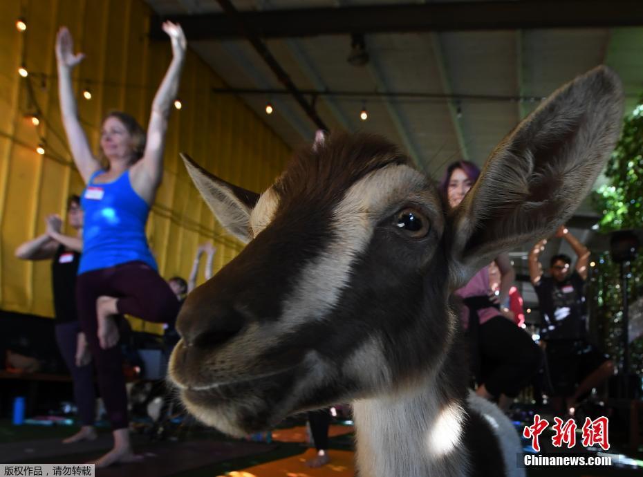 当地时间2018年5月7日,美国洛杉矶,瑜伽学员与尼日利亚矮山羊一同在当地酒吧参加瑜伽训练。