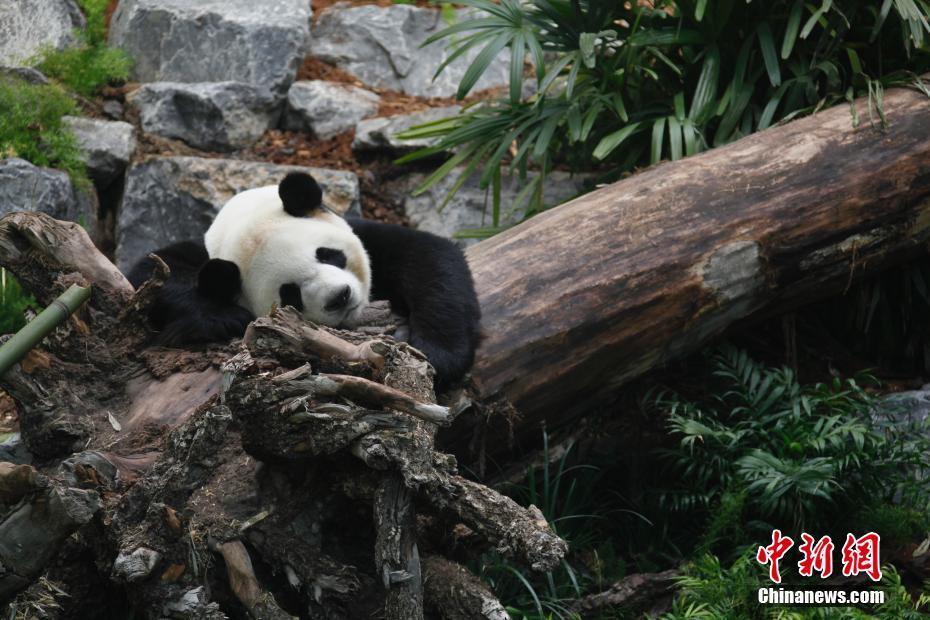 当地时间5月7日,中国租借给加拿大的4只大熊猫在它们位于卡尔加里动物园的新家“熊猫走廊”正式向公众亮相。雄性熊猫“大毛”和雌性熊猫“二顺”于2013年3月底来到加拿大。在多伦多住满5年后,它们以及“二顺”借助人工授精于2年半之前产下的龙凤胎兄妹“加盼盼”、“加悦悦”于今年3月底迁居卡尔加里并将在此再生活5年。图为“大毛”正在休憩。中新社记者 余瑞冬 摄