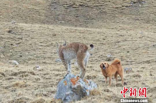 图为被流浪狗“包围”的猞猁。 东然加少 摄