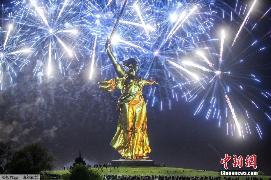 当地时间5月8日,俄罗斯伏尔加格勒燃放烟花庆祝反法西斯胜利73周年。