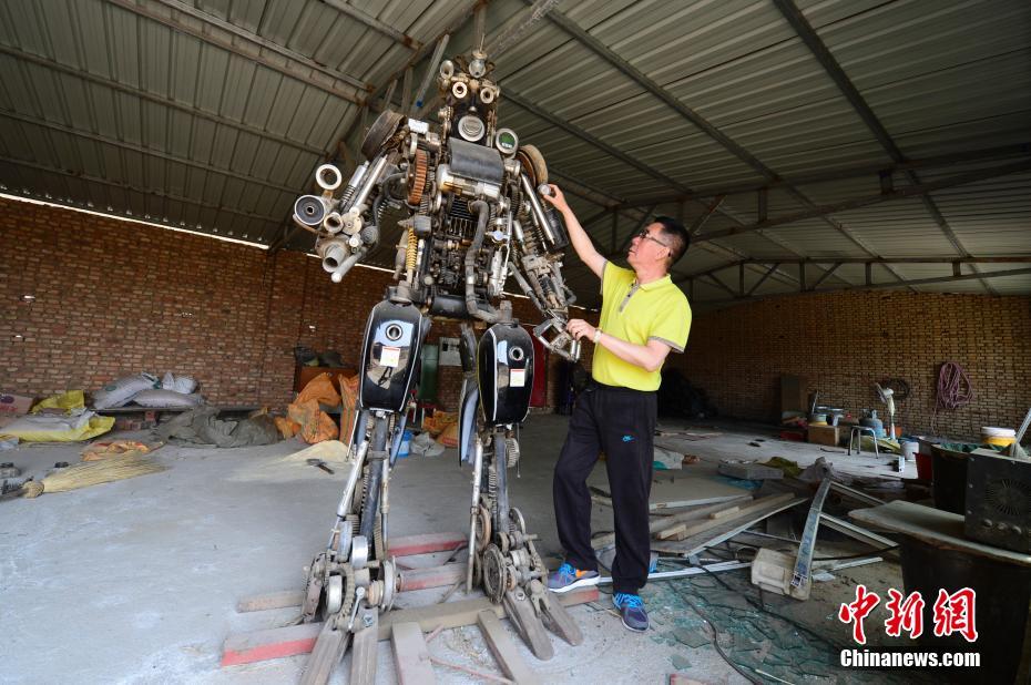 5月9日,王平在内蒙古呼和浩特的自家大院中检查“变形金刚”的零部件。据悉,该“变形金刚”高4.5米,重2吨有余,是王平利用退休的闲暇时间制作而成,材料多来自当地的废品收购站。 中新社记者 刘文华 摄