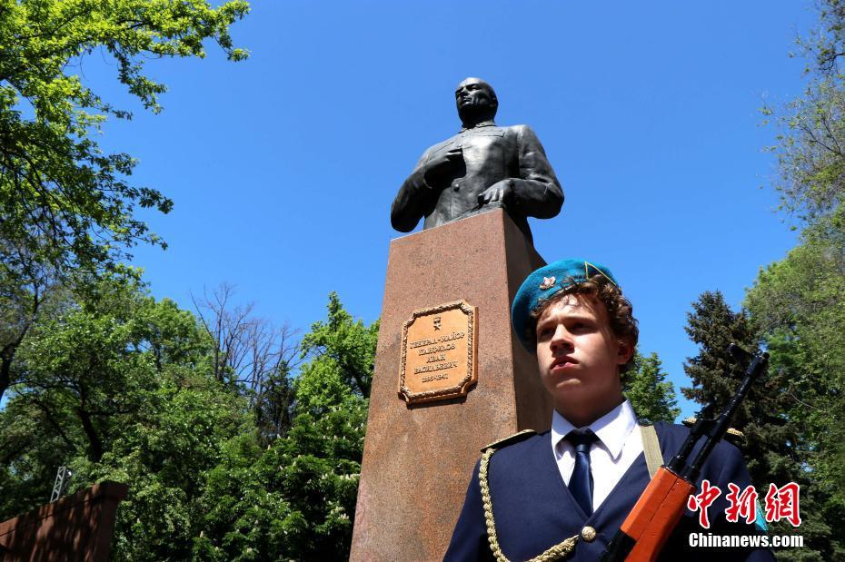 5月9日,哈萨克斯坦第一大城市阿拉木图隆重举行庆祝反法西斯战争胜利纪念日活动。图为位于阿拉木图的著名潘菲洛夫纪念碑,当天的许多重要庆祝活动都以其为中心展开。 中新社记者 汪金生 摄