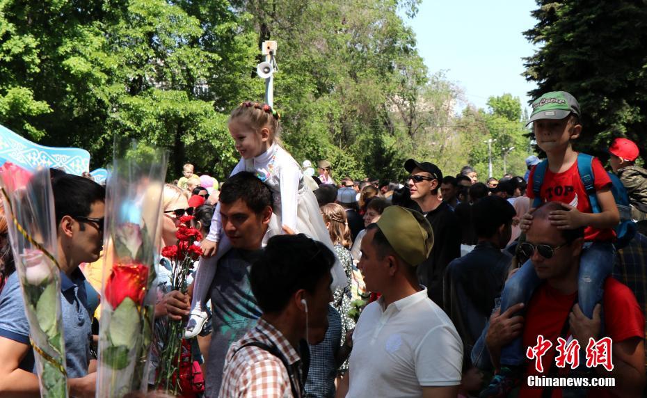 5月9日,哈萨克斯坦第一大城市阿拉木图隆重举行庆祝反法西斯战争胜利纪念日活动。当地民众纷纷前往潘菲洛夫勇士公园缅怀先烈。 中新社记者 汪金生 摄