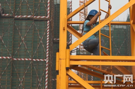 央广网成都5月8日消息(记者陈锐海 郑重)成都双流郊外的工地上,塔吊有30多米高,周艳沿着阶梯一级一级往上爬。在顶部的控制室里,她操纵着机器,开始一切建设,底下高楼逐日升起。