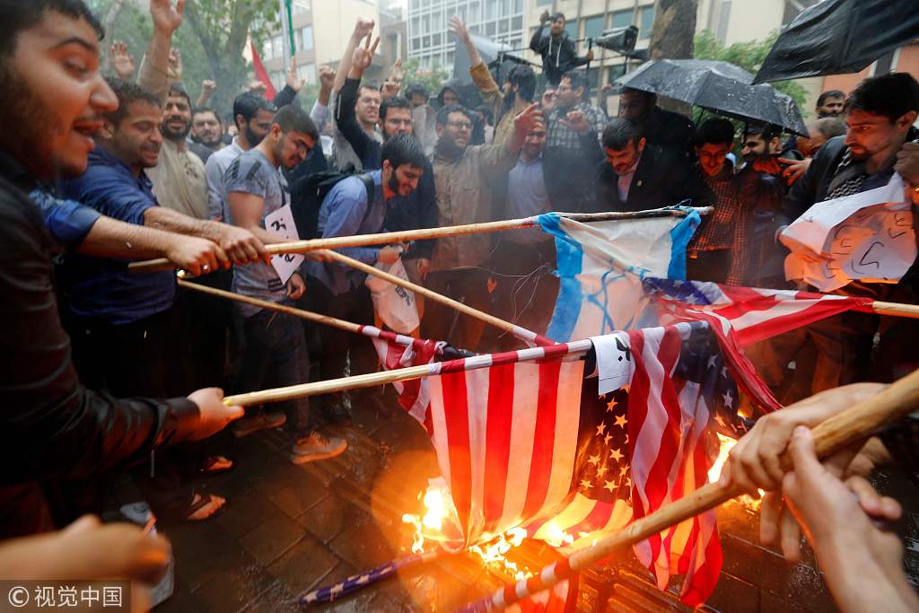 当地时间2018年5月9日,伊朗德黑兰,伊朗民众在前美国大使馆总部外示威,抗议美国退出伊核协议。