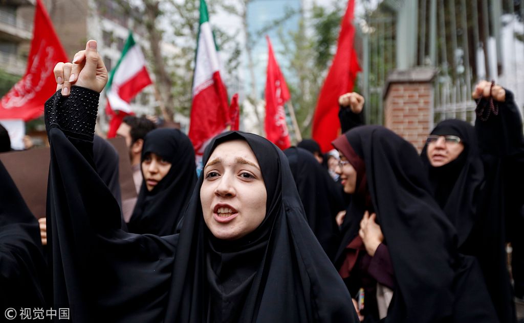 当地时间2018年5月9日,伊朗德黑兰,伊朗民众在前美国大使馆总部外示威,抗议美国退出伊核协议。