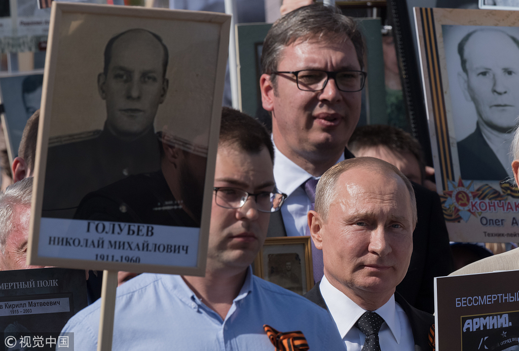 当地时间2018年5月9日,俄罗斯莫斯科,俄罗斯总统普京和以色列总理内塔尼亚胡参加“不朽军团”游行,纪念战胜纳粹德国73周年。