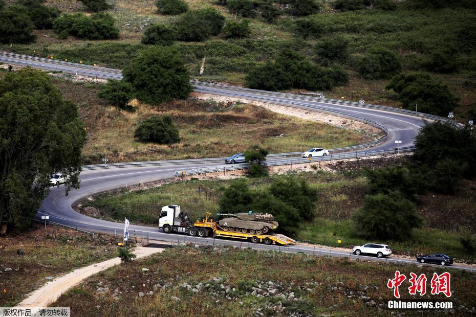 在叙以边境的戈兰高地,一辆拖车正载着一辆以色列军方的坦克前进。