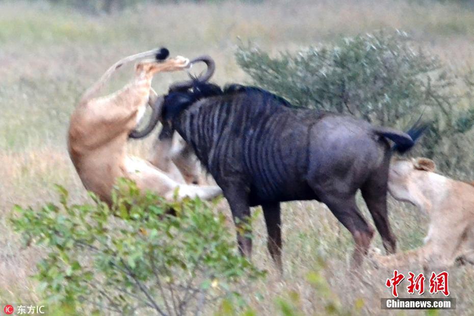 2018年5月9日报道,南非克鲁格国家公园,Hannes Joubert在当地游玩的时候发现了一头正在洗泥浴的牛羚,同时发现这头牛羚的还有两头饥肠辘辘的母狮。母狮抓住时机扑向牛羚,很快便将牛羚压制住了,眼看牛羚已在劫难逃,正在这时它又快速地奋起反抗。画面中,牛羚用牛角作为防御武器,更是牛角钩住了其中一头母狮的后肢将其顶上了半空,以一己之力对战两头母狮,画面相当震撼。 图片来源:东方IC 版权作品 请勿转载