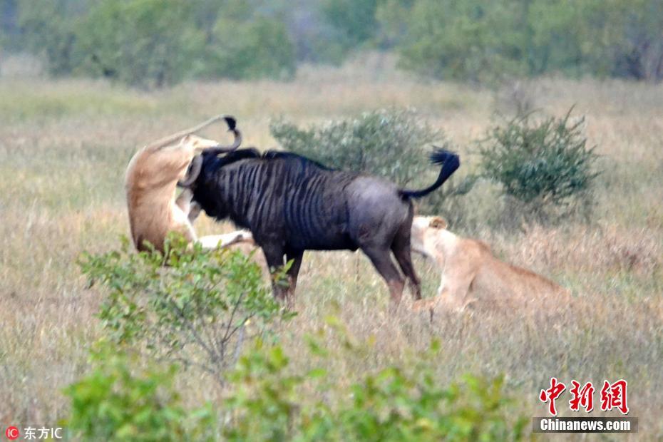 2018年5月9日报道,南非克鲁格国家公园,Hannes Joubert在当地游玩的时候发现了一头正在洗泥浴的牛羚,同时发现这头牛羚的还有两头饥肠辘辘的母狮。母狮抓住时机扑向牛羚,很快便将牛羚压制住了,眼看牛羚已在劫难逃,正在这时它又快速地奋起反抗。画面中,牛羚用牛角作为防御武器,更是牛角钩住了其中一头母狮的后肢将其顶上了半空,以一己之力对战两头母狮,画面相当震撼。 图片来源:东方IC 版权作品 请勿转载