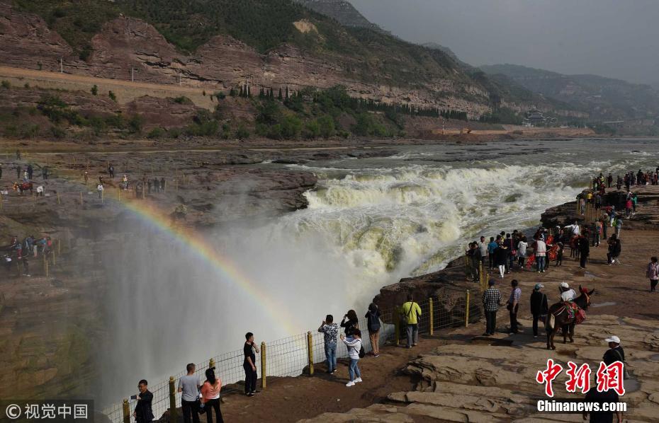 2018年5月11日,游客在山西临汾吉县黄河壶口瀑布景区游览。近日,受黄河干流来水量减少影响,晋陕峡谷水流变缓,泥沙沉淀,壶口瀑布水色明显变清,呈现“清流飞瀑”的别样美景。 吕桂明 摄 图片来源:视觉中国