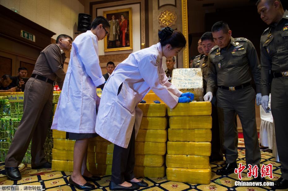 当地时间5月11日,泰国警方在曼谷展示缴获的毒品。曼谷市区的运送茶叶的车队中查获1千万“野马”(Yaba)药丸和近半吨冰毒。